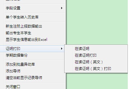 说明:图示菜单的“在读证明”和“在读证明(英文)”适用于证明预览,如若打印在读证明,请选择“在读证明打印”或“在读证明(英文)打印”。